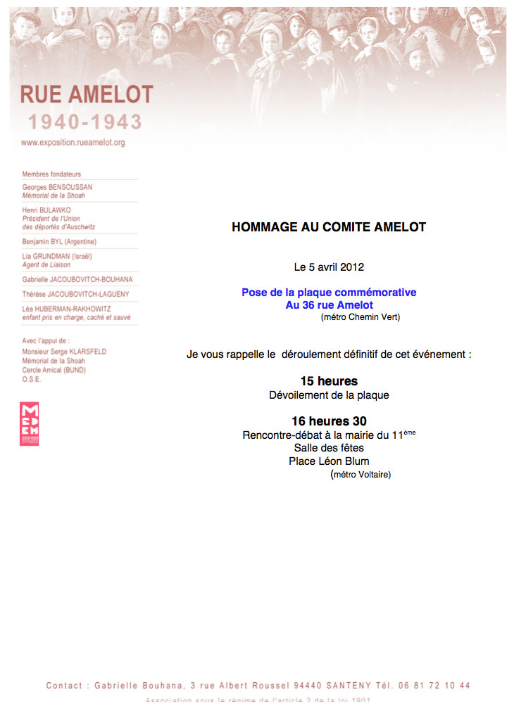 Sommaire - Introduction - I Les bases du Comité "Rue Amelot" - II La "Rue Amelot" résiste - III Rue Amelot et le Comité de Coordination - IV Modification dans la structure de Rue Amelot - V L’activité de bienfaisance de rue Amelot - VI Le sauvetage des enfants - VII L’aide des non juifs - VIII De l'arrestation de Rappoport à la libération de Jakub Byl - Lexique Noms des personnes - Lexique Organisations et évènements - Iconographie