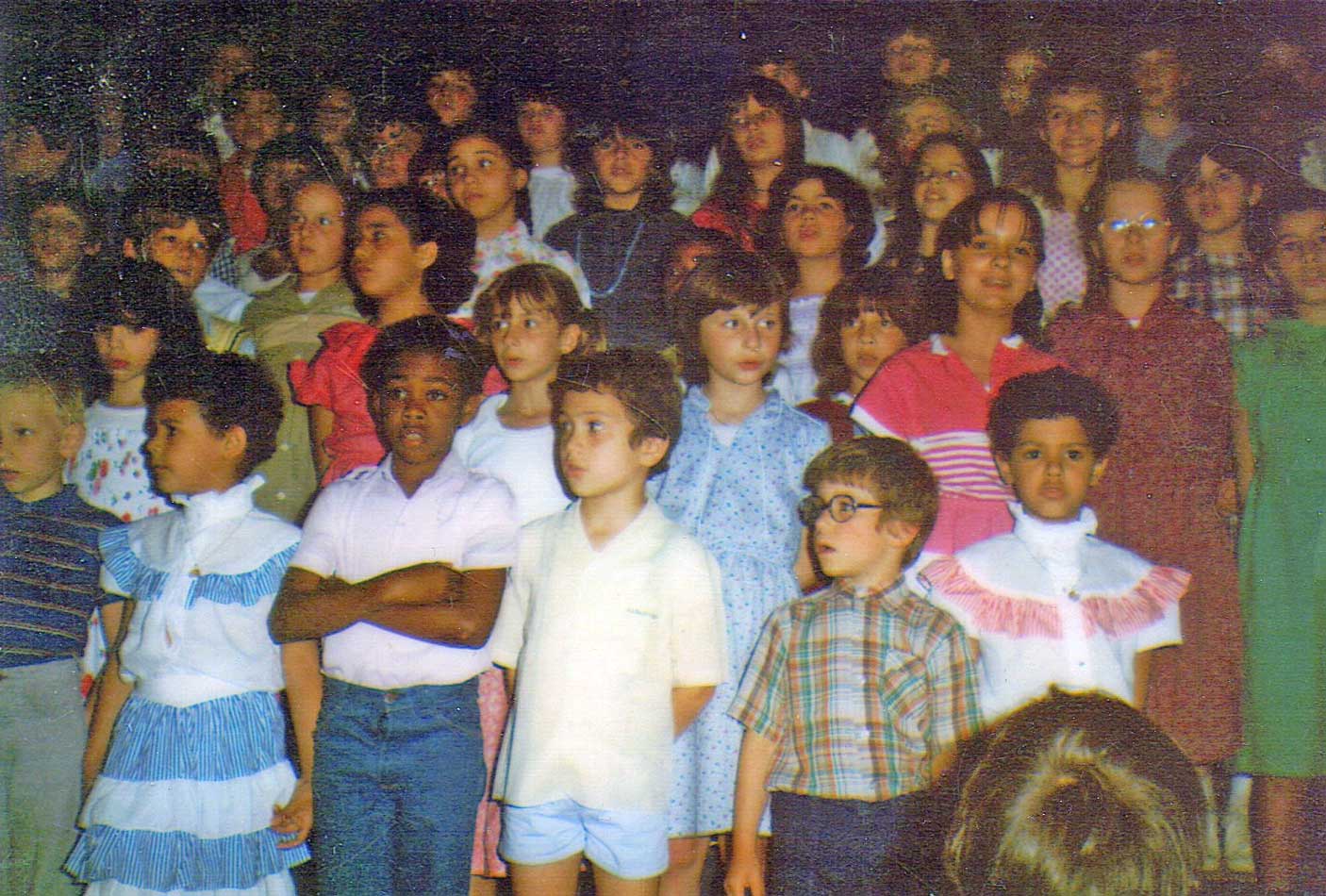 Sur la photo jointe, je suis au 2ème rang, en blanc avec des couettes, entre la fille an robe bleu et celle en robe rose.